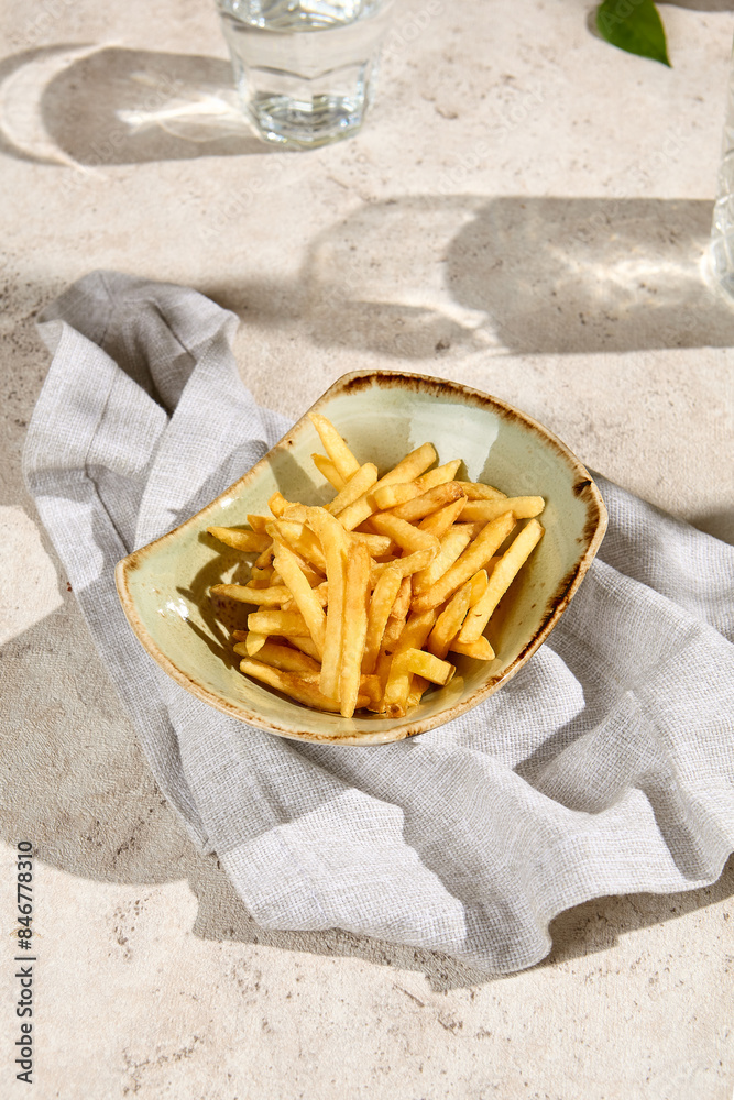 Golden French Fries in Sunlight with Shadows on a Summer Day Outdoors