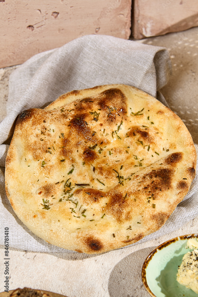 Fresh Homemade Focaccia Bread With Rosemary, Sunlight and Shadows on a Summer Day