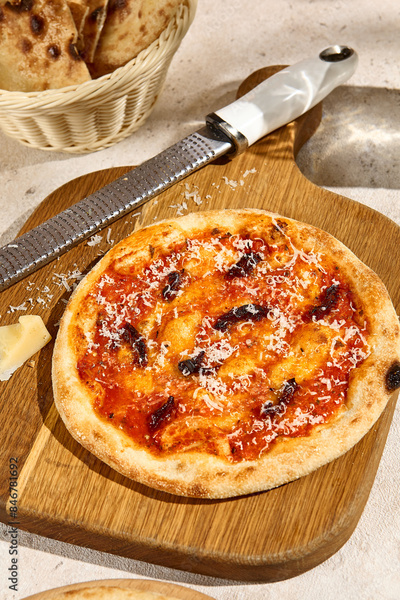 Sunlit Summer Focaccia with Dried Tomatoes and Cheese on a Wooden Board