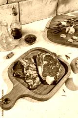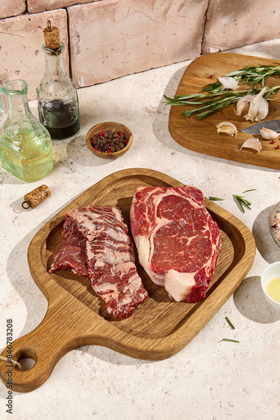 Fresh Raw Steaks on Wooden Board with Sunlight and Shadow, Featuring New York Strip and Chuck Roll, Summer Vibes