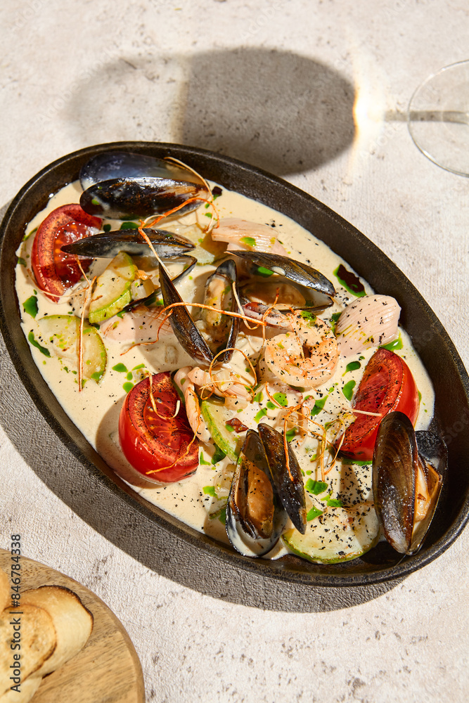 Seafood Sauté with Vegetables in Cream Sauce under Sunlight and Shadow - Summer Delight