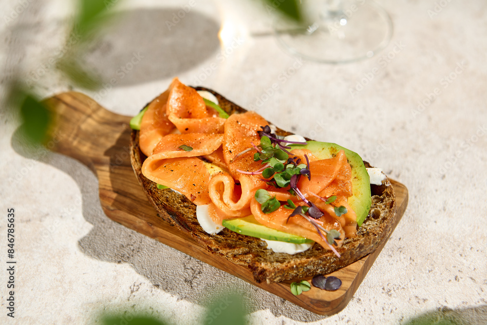 Fresh Bruschetta with Salmon and Avocado on Wooden Board Under Sunlight with Summer Shadows