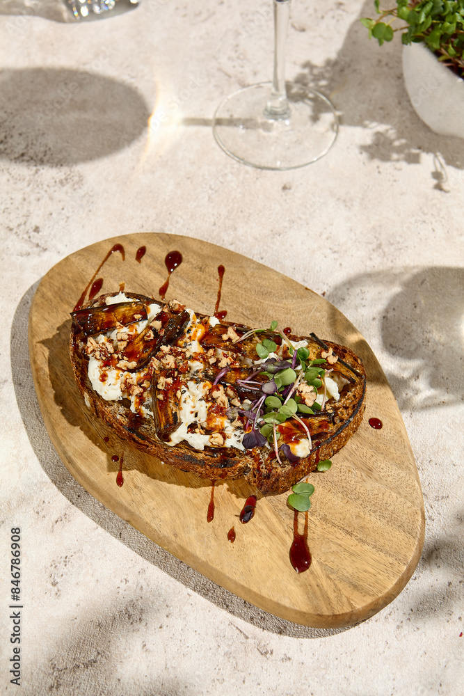 Delicious Eggplant Bruschetta with Homemade Cheese and Nuts in Sunlit Summer Scene