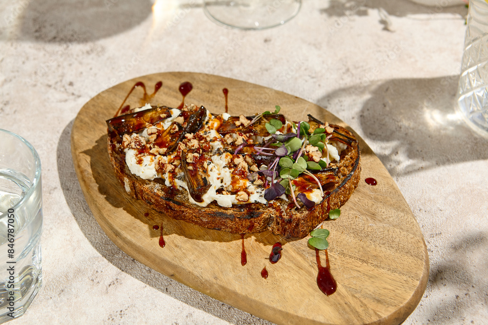 Gourmet Summer Bruschetta with Eggplant, Homemade Cheese, Nuts, Light and Shadow