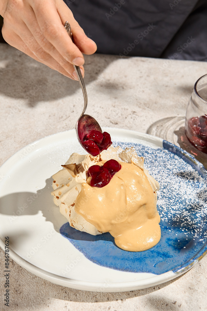 Pavlova Meringue Dessert with Cherry and Condensed Milk Mousse in Sunlit Summer Shadow