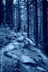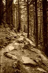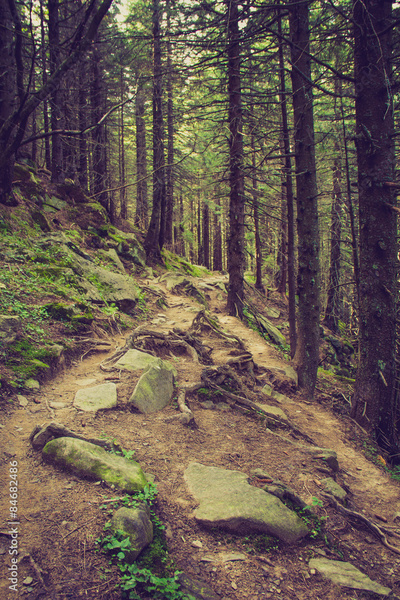 Dense mountain forest and path between the roots of trees.