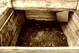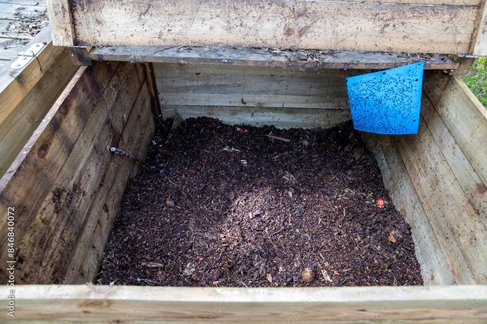 Intérieur d'un grand compost en bois, du compost avec des moucherons