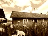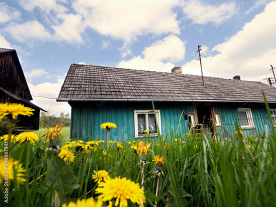 Stary opuszczony drewniany dom i budynki gospodarcze w wiosennej scenerii wśród kwitnących polnych kwiatów.