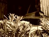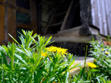 Stary opuszczony drewniany dom i budynki gospodarcze w wiosennej scenerii wśród kwitnących polnych kwiatów.