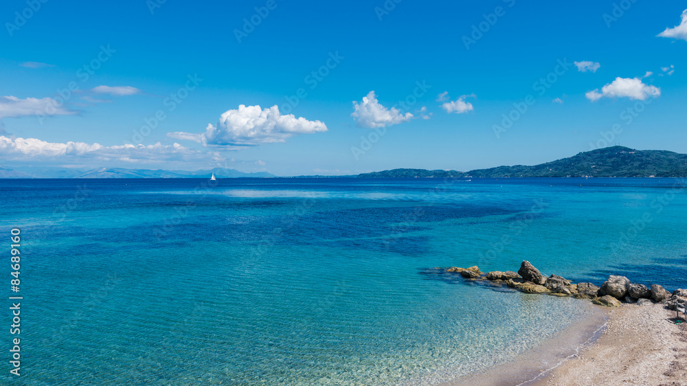 Golden sandy beach and Mediterranean sea near Agios Ioannis Peristeron, Corfu.
