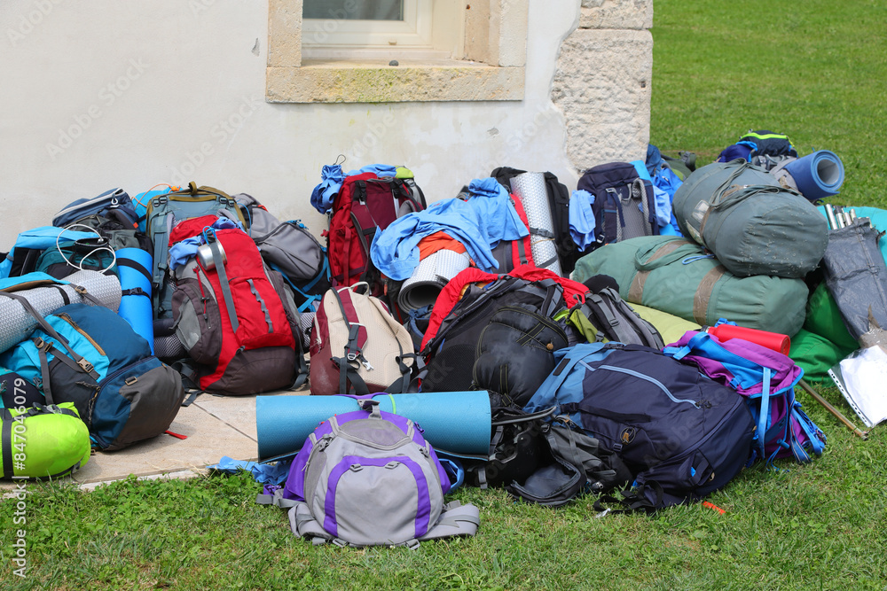 pile of backpacks and sleeping bags belonging to young adventurous backpackers during a world tour