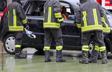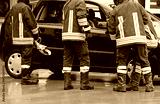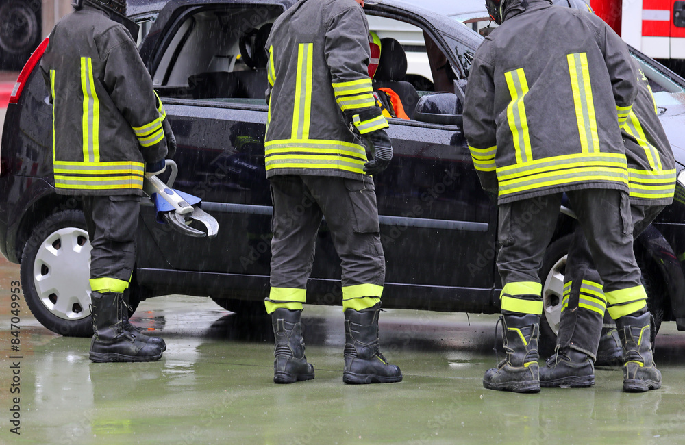 group of firefighters using hydraulic shears to extricate a car after a traffic accident with injured person