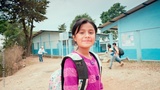 Portrait of a beautiful girl with a magenta sweater in front of her school.