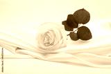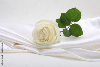 Beige cream rose flower on white nacre wave fabric silk texture copy space background.