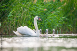 Mother swan with babies swans in Baraba sandpit quarry near Melnik, Czech republic in Spring