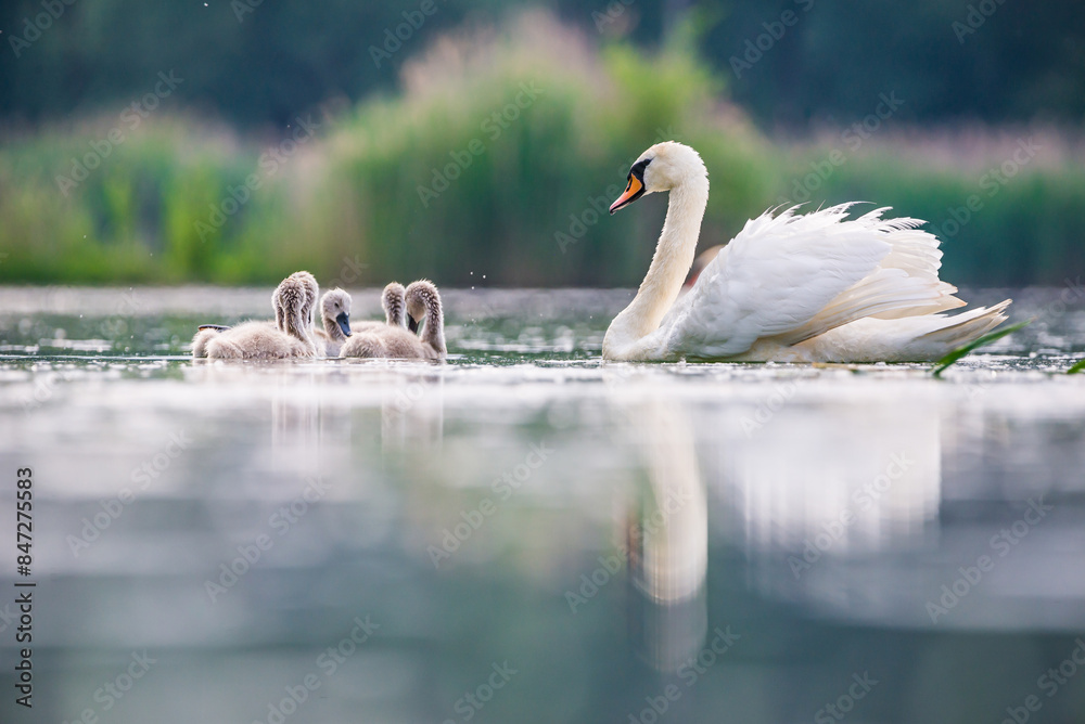 Mother swan with babies swans in Baraba sandpit quarry near Melnik, Czech republic in Spring