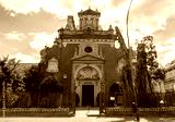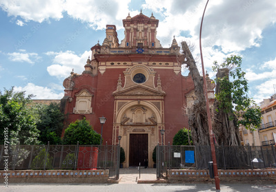 View of the facade of the Church of San Jacinto, with its centuries-old ficus tree, located in the famous Triana neighborhood, in Seville, Spain.