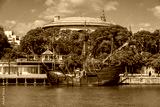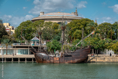 Replica of the Nao Victoria, the first ship circumnavigate the world commanded by Ferdinand Magellan, docked on the Guadalquivir River as a tourist attraction in Seville, Spain.