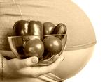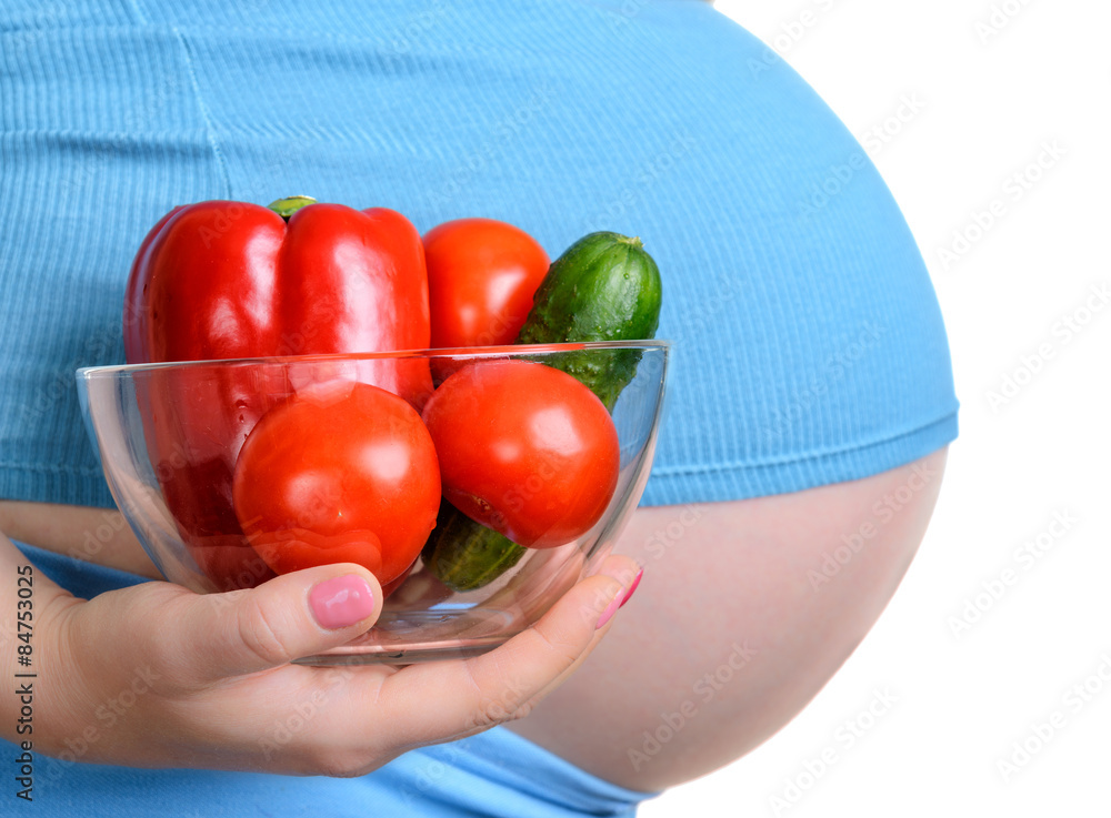 Pregnant woman with big belly holding fresh vegetables isolated on white