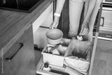 Woman throwing trash into household bins for waste sorting in the kitchen for recycle. Plastic, paper, bio and mixed waste. Sorting waste at home concept
