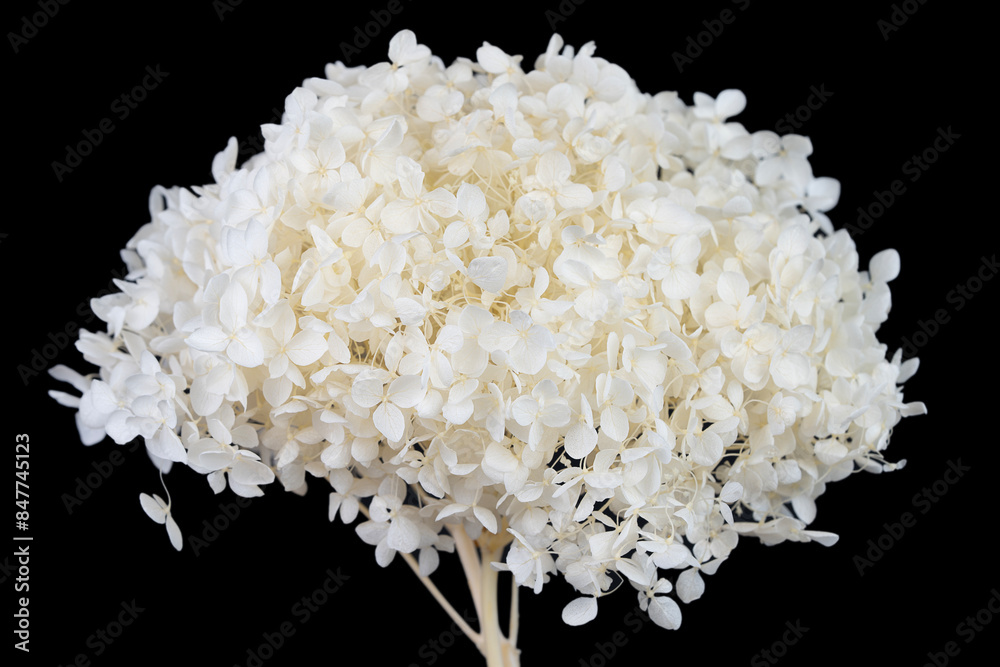 Hortensia hydrangea blooming fresh white flowers full big branch on black background macro