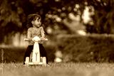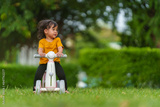 happy baby toddler girl rides plastic motorcycle toy in the park