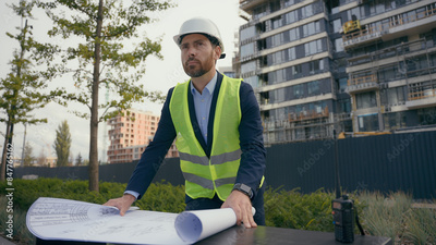 Urban city development business Caucasian man guy male businessman builder engineer in safety hat hard hat looking plan architect civil foreman inspection blueprint construction site building project