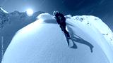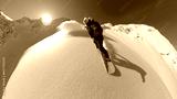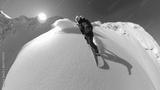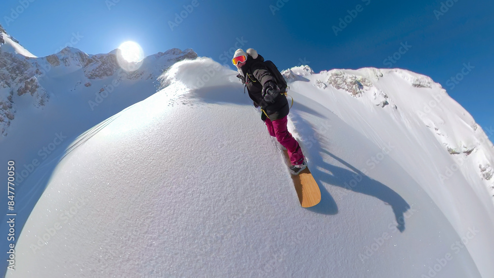 PORTRAIT, SELFIE: Lady with a big smile snowboarding on untracked powder snow