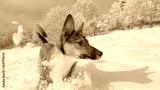 CLOSE UP: Snow spraying while cute young dog is running around in powder snow