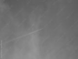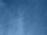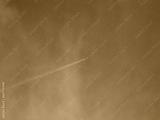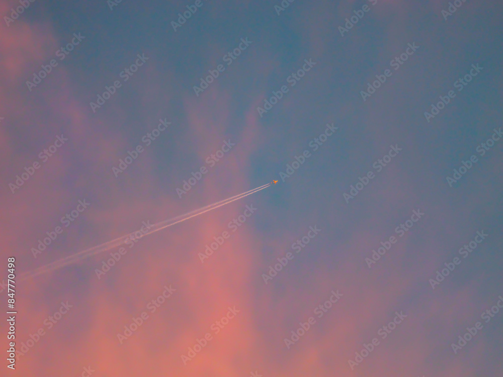 Amazing pink colored cloud in a blue sky and flying airplane leaving contrails