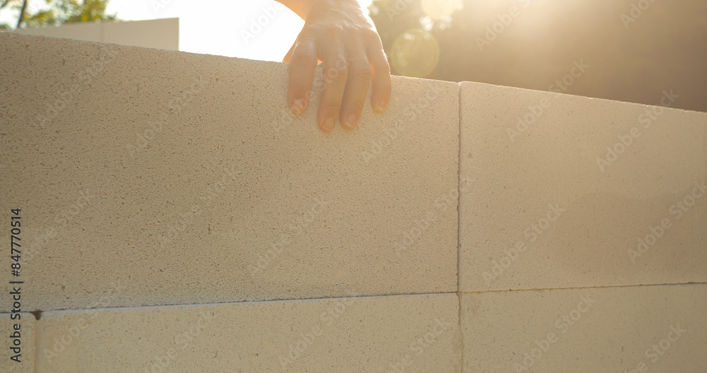 Sunbeams shine over brick wall and working hand puts one grey block on the top