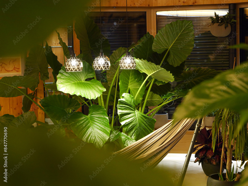 Relaxing evening ambience in the embrace of lushly growing tropical houseplants