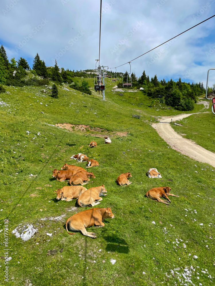 Chairlift ride above cows resting on green alpine grass on a sunny summer day