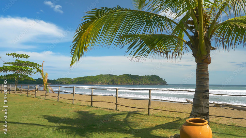 Stunning view of lush jungle peninsula from oceanfront resort garden in Panama