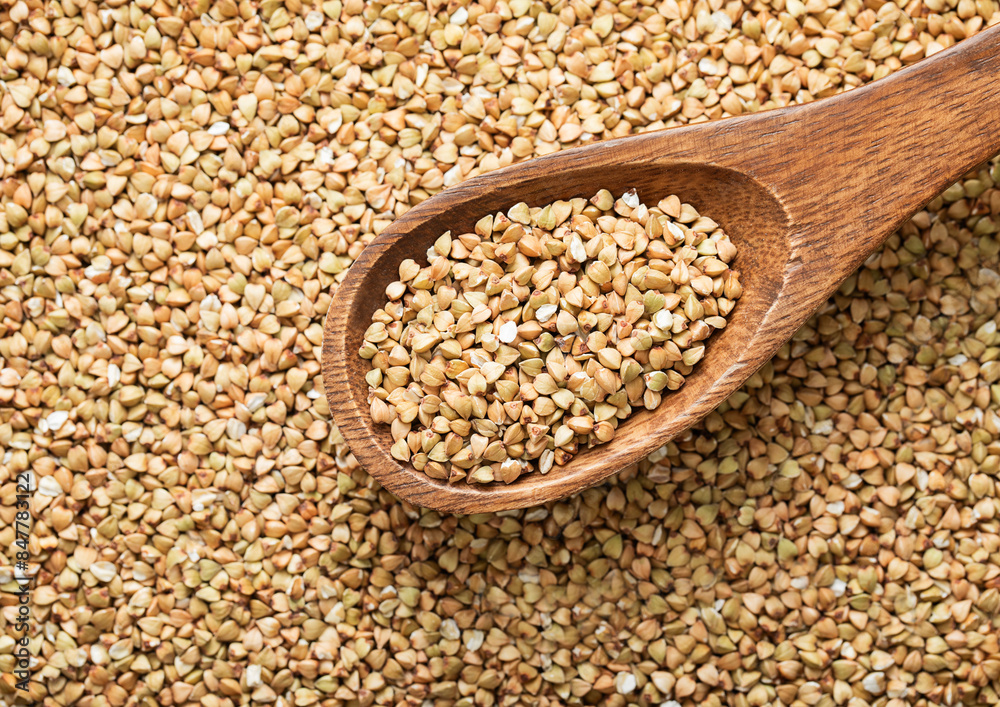 Spoon with raw organic healthy green buckwheat seeds.Macro.