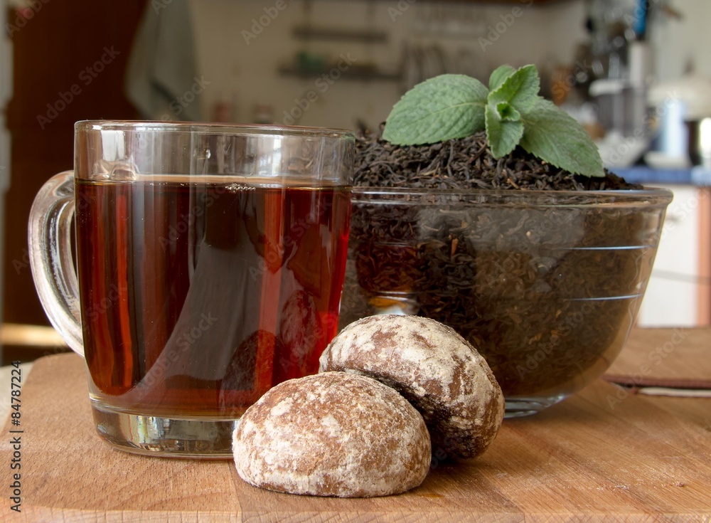 large leaf black tea with mint in a glass on the table with gingerbread,