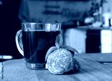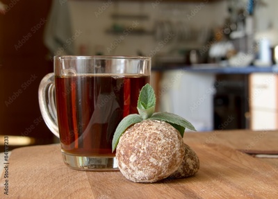 large leaf black tea with mint in a glass on the table with gingerbread,