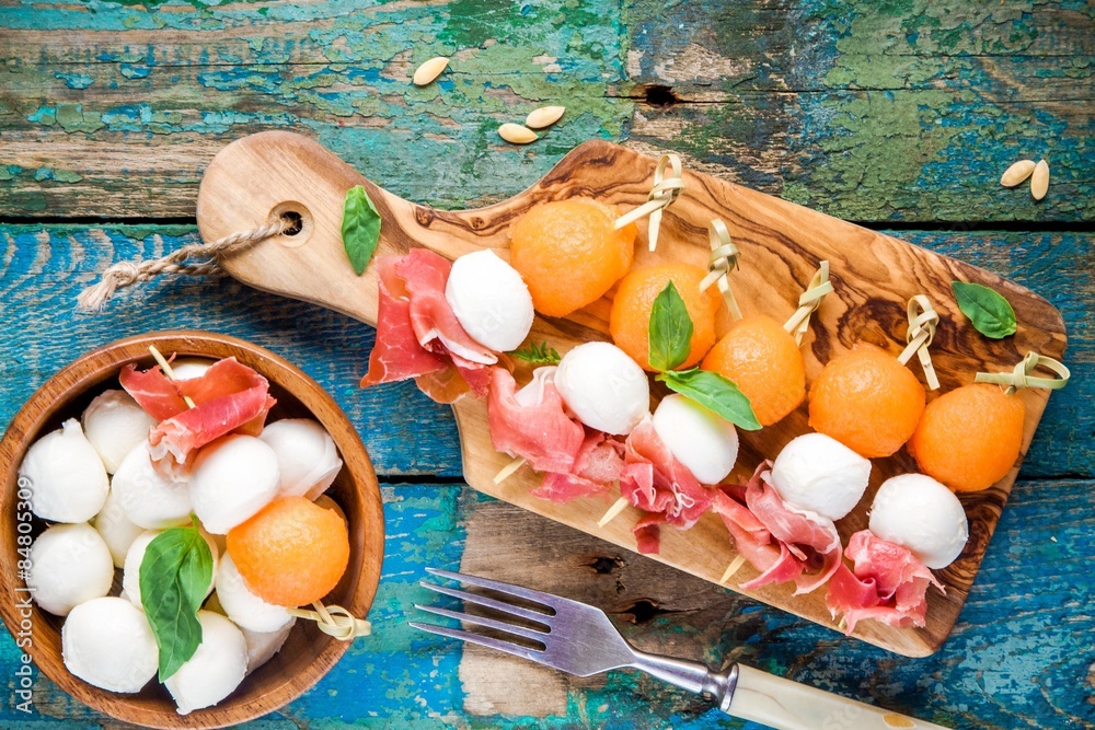 mozzarella and prosciutto with melon canapes with basil on a cutting board