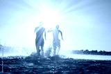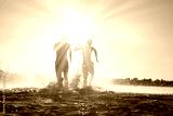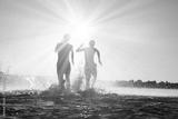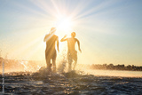 Glückliche junge Menschen laufen und springen am See beim Sonnenuntergang