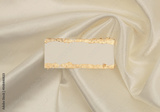 Gold glitter empty canvas paper frame on beige silk fabric background. Abstract copy space texture.
