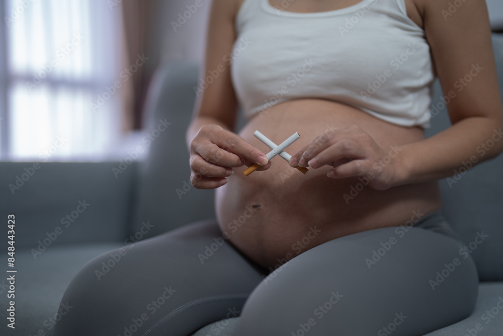 A Portrait of Asian pregnant woman smoking cigarette. Having a baby. Family people lifestyle. Mom love.