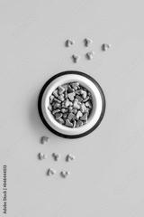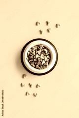 Bowl of biscuits for pets - food in a shape of heart, top view