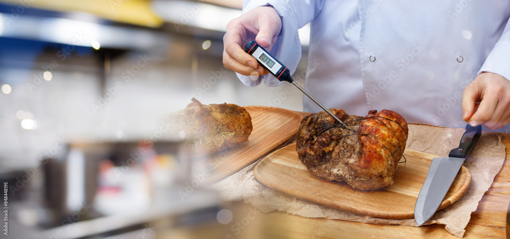 Cook measuring temperature of cooked meat on table.