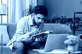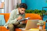 Indian man student freelancer study with book at home on laptop computer. Arabian guy make conference video call talking to webcam. Online teacher e-learning in remote chat. Distance education online
