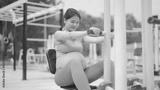 A portrait of happy Asian pregnant woman at gym fitness center club. Having a baby. Training workout. Exercise indoor with sport equipment. Athletic. Family people lifestyle. Mom love. Recreation.