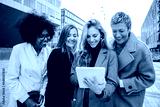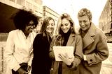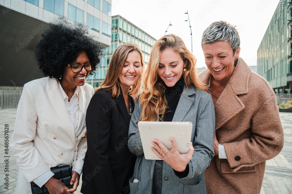 Group of only mid adult business women using a touchpad to work. Successful corporate female coworkers watching reports on a digital tablet . Professional office real ladies on a executive meeting