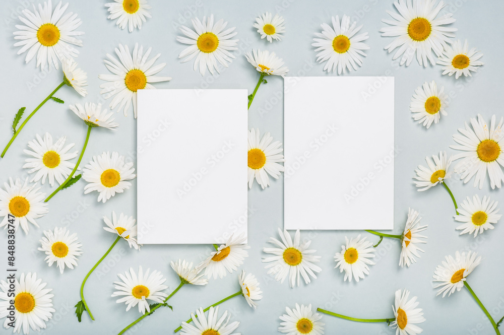 Blank mockup of greeting or invitation card with white chamomile flowers with copy space