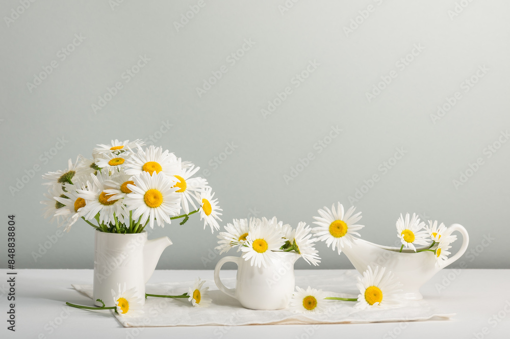 Ceramic gravy boats, vases with white daisies. Summer mood, decor. Greeting card, copy space