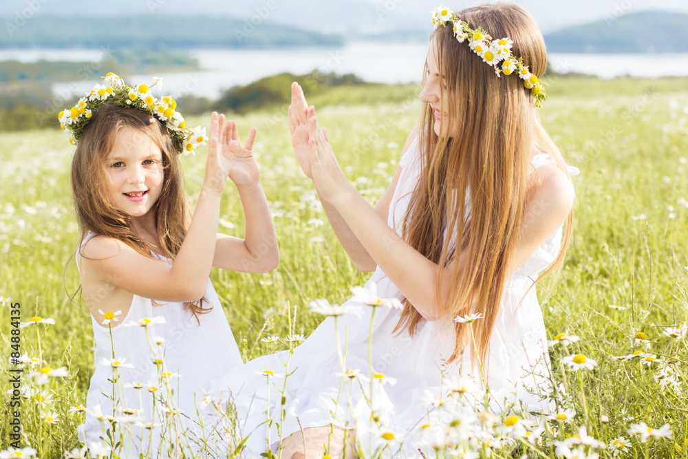 Two pretty sisters at field with mountains view