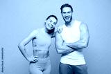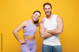 Young smiling happy fun fitness trainer instructor sporty two man woman wears blue clothes spend time in home gym put hand on shoulder isolated on plain yellow background. Workout sport fit concept.